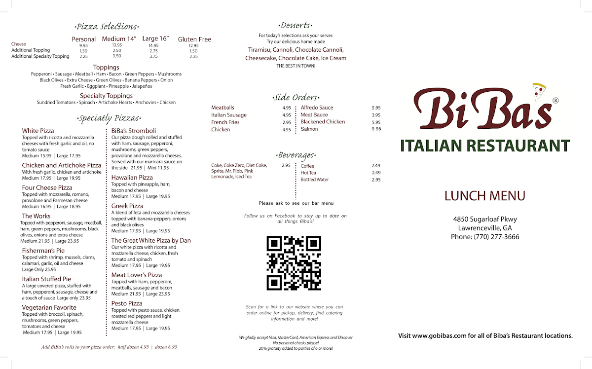 Welcome to BiBa's Italian Restaurant, located at 4850 Sugarloaf Parkway in Lawrenceville, GA, where Italian culinary traditions come alive. Our menu features an array of authentic dishes, perfect for any occasion, from cozy family lunches to elegant dinners.